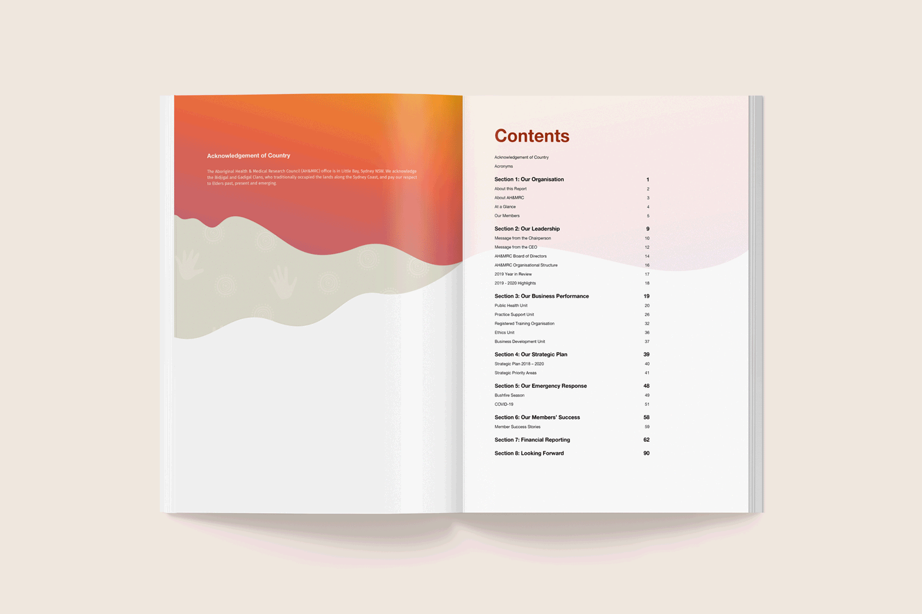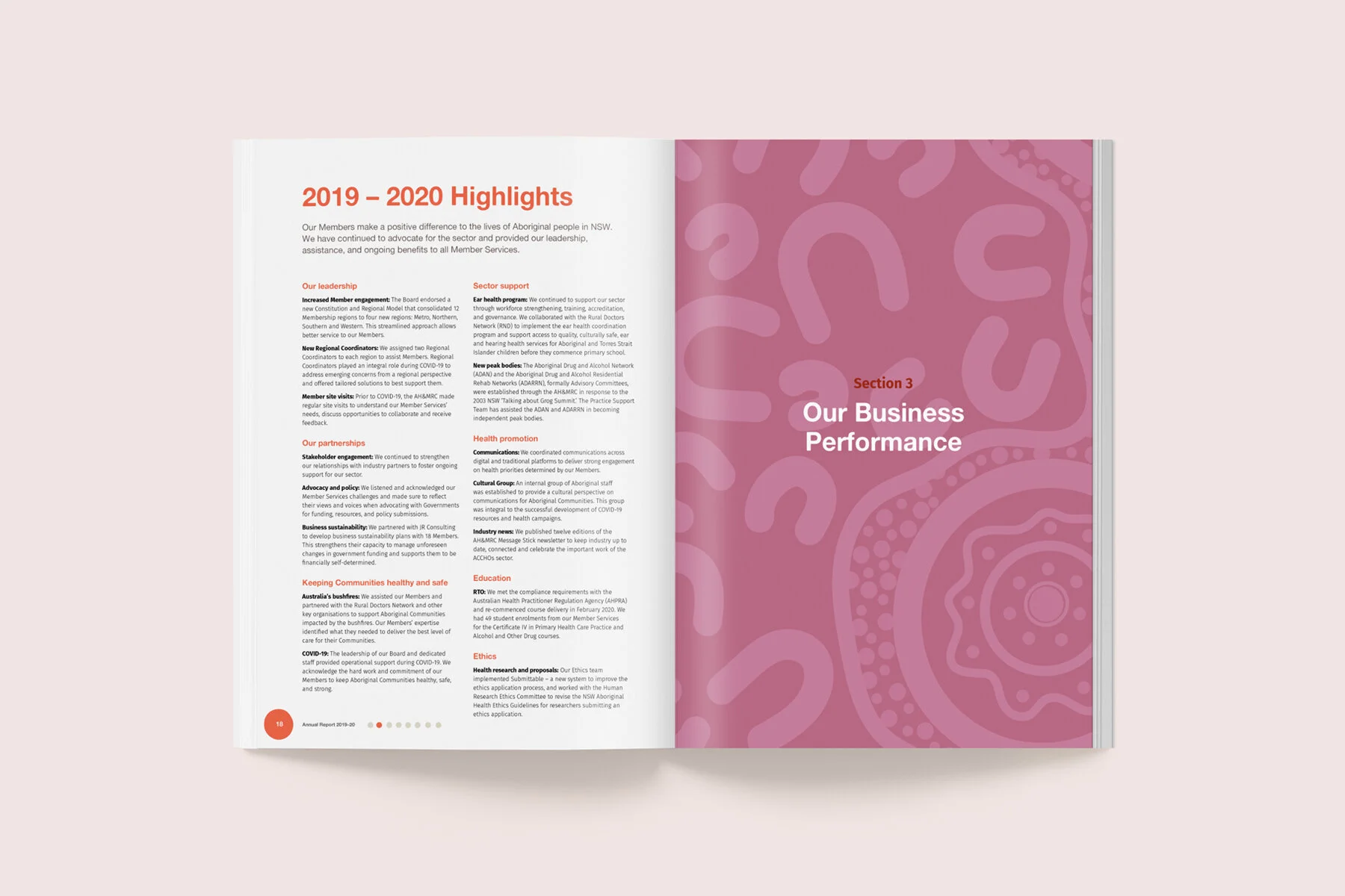 We worked with the Aboriginal Health & Medical Research Council of NSW to design their Annual Report for 2019–20. The background throughout the report incorporated the amazing artwork of Aboriginal artist Madison Connors.