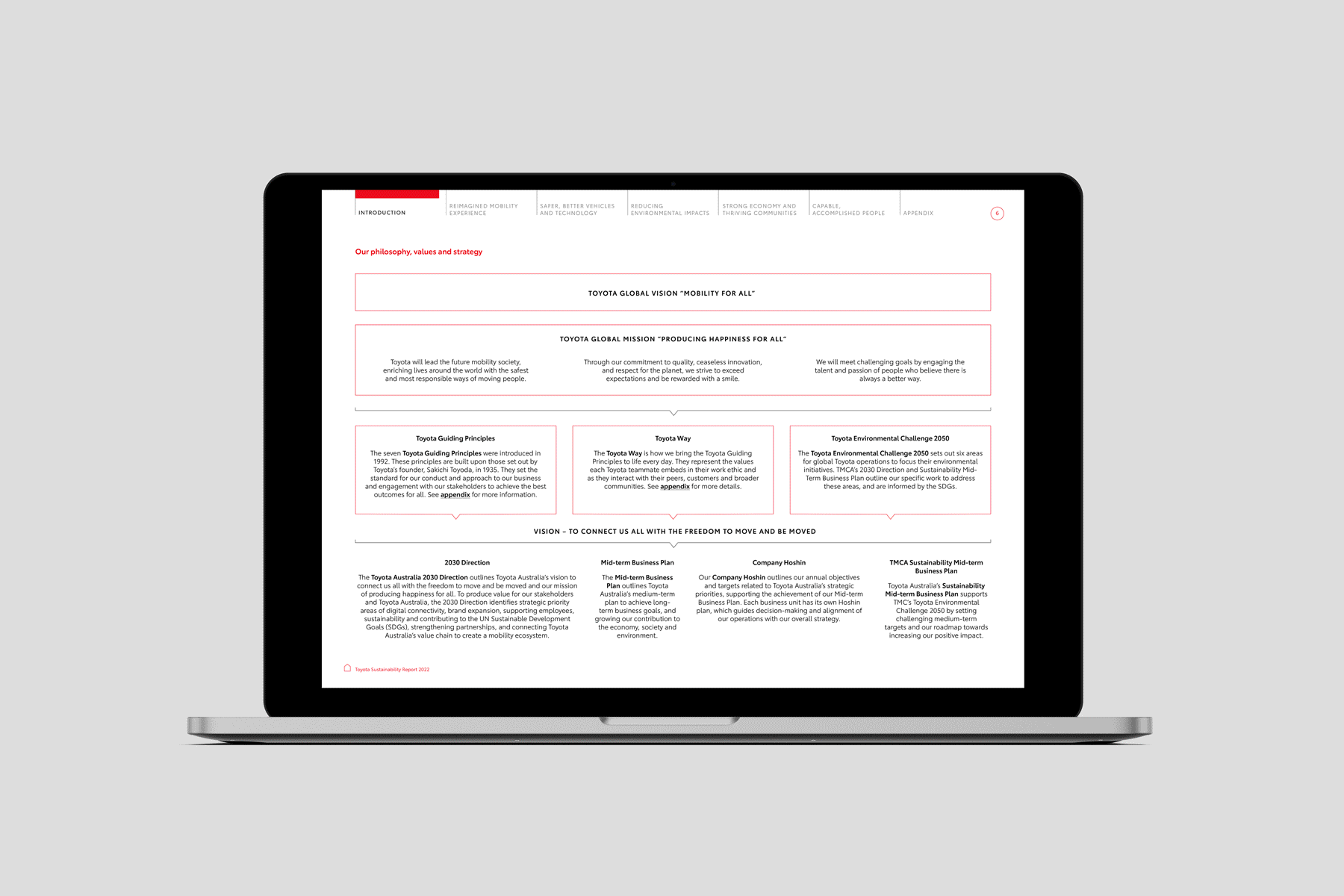 We worked with Toyota Australia to design their Sustainability Report FY22. The digital publication details their performance for the 2022 Financial Year and combines customised infographics, illustrations, bold brand colours and imagery that reflects the sustainability achievements, values and vision of Toyota Australia.