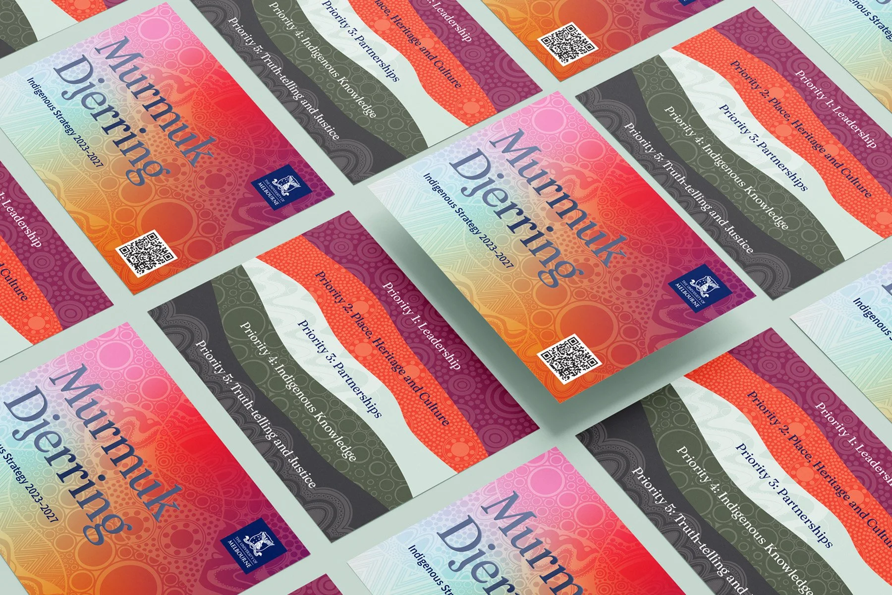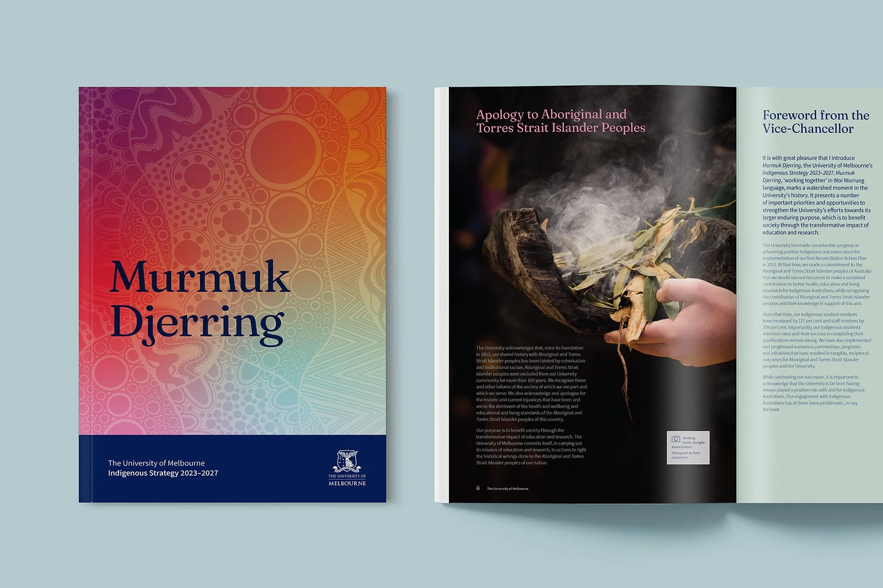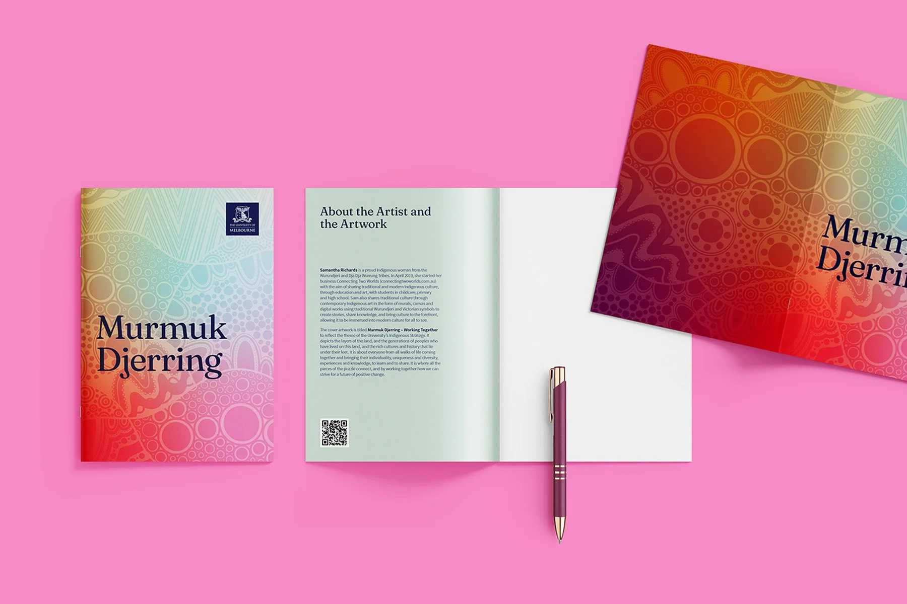 We worked with The University of Melbourne to launch Murmuk Djerring—Indigenous Strategy 2023–2027. This included a 48 page strategy which sat alongside postcards, notebooks, banners, digital screens and a 12-metre-tall billboard!